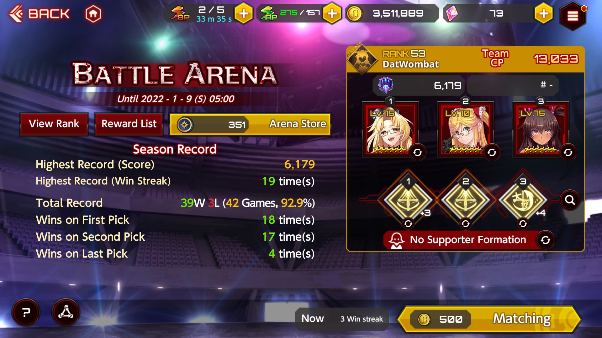 The matchmaking for Battle Arena is a shit show. When I started with low-level Taimanins, my battles were relatively balanced against new players. But once I Ascended my first Taimanin, she alone steamrolled every team — no matter how many matches I fought, the Battle Arena refused to pair my fighters with equal strength opponents. I ended up building weak Taimanins to prevent my team from ending fights too fast.