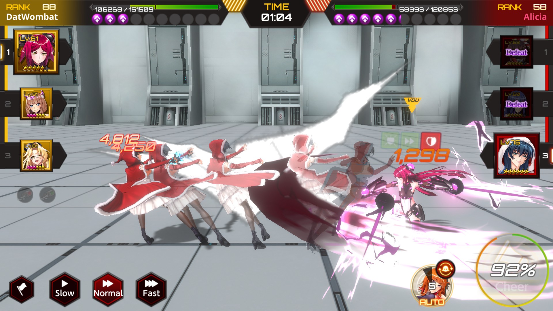 Combat between Taimanins is automated; attacking players may only activate Supporters or provide a random boost in the form of a “Cheer”. Although players are allowed teams of three, fights are strictly one-versus-one. Taimanins can’t be “swapped” or provide any form of assistance to each other during battle. Fights take place on flat 2D plane, probably to facilitate quick results. Taimanins only perform basic instructions; melee characters charge and swing, and ranged characters stay put and shoot.