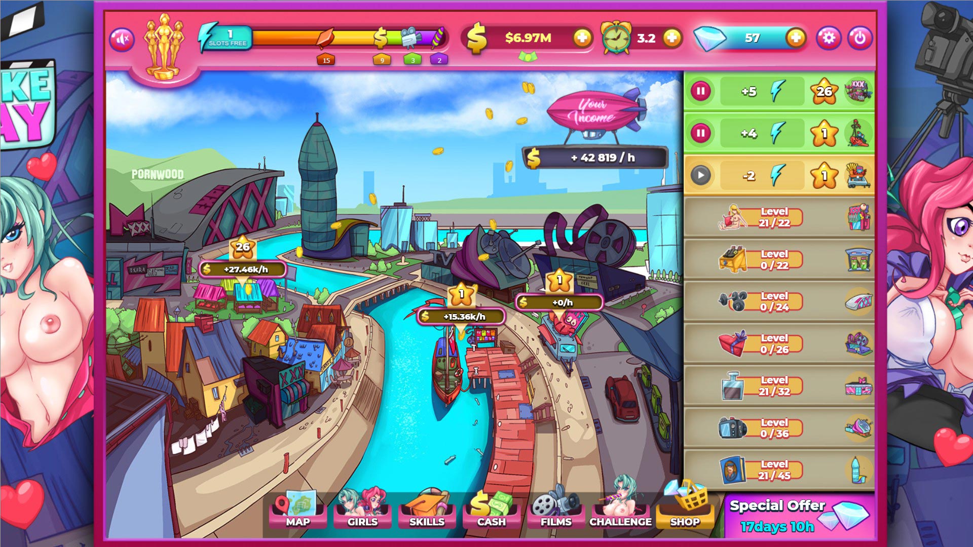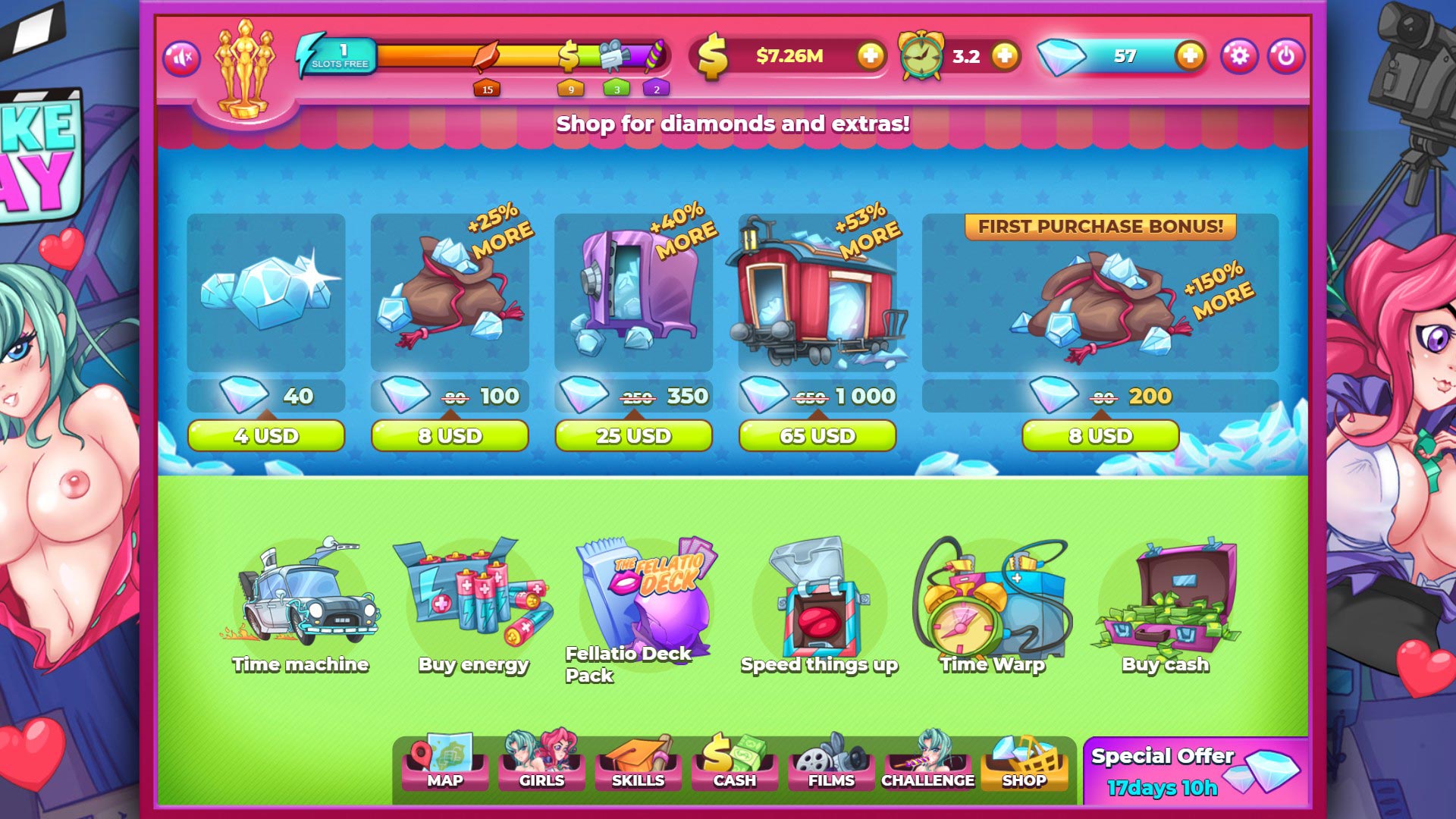 The goal is to make your patrons fall in love with you, using their affection (and sheer lust) to shoot sex-films with ’em (and turn a profit). Each girl requires a combination of “Sweet Talk”, “Gifts”, and dates. You have a limited number of “Energy Slots” which are used to perform actions. Energy is never expended, but all actions soak up one or more Slots. As you gain more Energy you are able to perform additional actions at any given time. Gifts cost money, which can be aquired by investing energy into properties. New properties cost money, and many require skills, aquired by investing energy into activities.