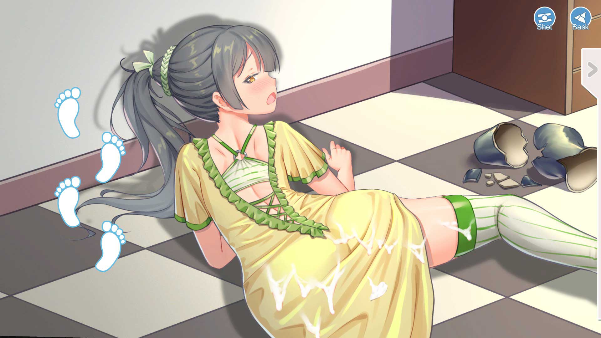 Pick a stage, any of ten stages. Each stage features an animated waifu, and four levels. To complete each level, you must fold a virtual piece of paper into a specific shape. For those of you that are origami -challenged, there is an “Easy” mode to ease the pain. If you get stuck, there’s a “Help” button that’ll show you how to solve each puzzle. If the “Help” button doesn’t cut it (or if you’re the lazy type), there’s the “Skip” button that does what it says. After completing a stage, you’ll unlock a lewd scene, and undress the animated waifu.