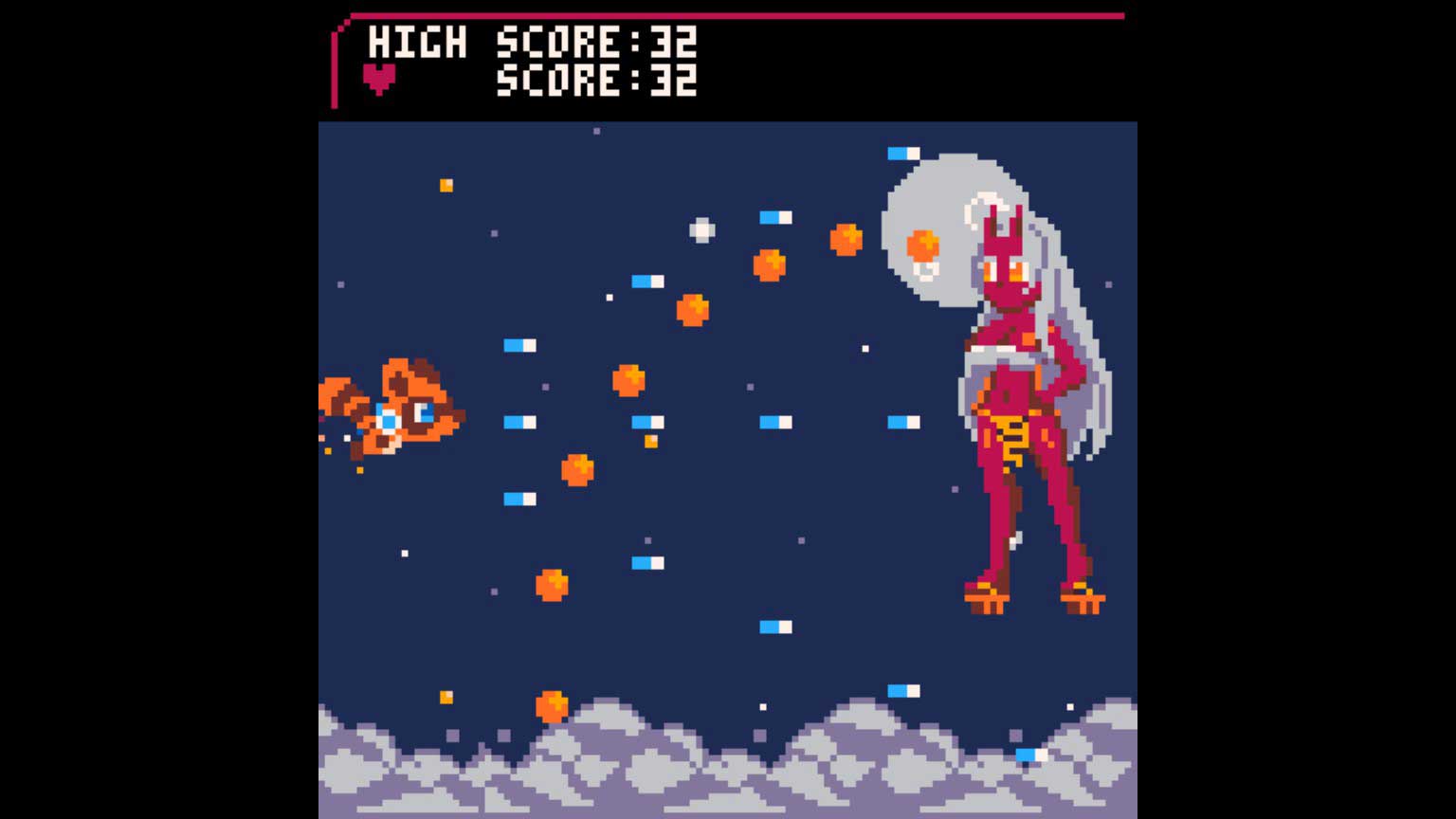 The titlescreen is plain and simple — and certainly stylistically appropritate. There are no adjustable user preferences, so if you want to mute the game you’ll have to do so externally. The game takes place in a one-to-one ratio, though the application is fullscreened by default. The playable characters are much larger than the projectiles that you’ll be dodging — however, your hitbox is located somewhere around the eyes. I think this is a big oversight on the developer’s part, and they could have at least let us know how to play the game.