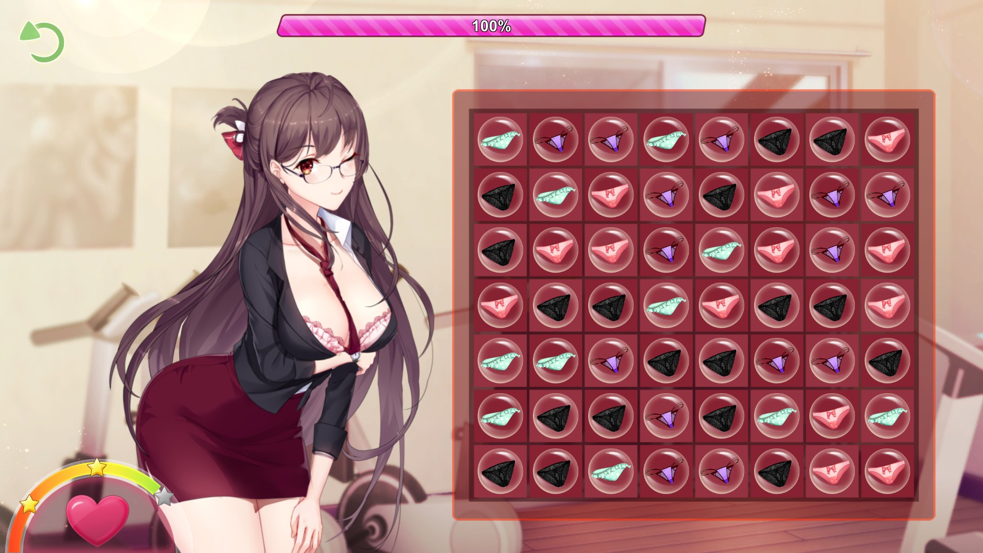 The goal is to conquer your adversaries. And by that I mean match rows o’ colored panties within a time limit. You can earn up to three stars, each star denoting a certain speed of completion. Each row o’ panties contributes to a score, and after reaching the designated number it’s mission complete. You gain a certain amount of affection based on your performance, which is used to unlock lewd CGs. You will need to complete stages (or chapters) multiple times to gain enough affection to see more than naked ladies.