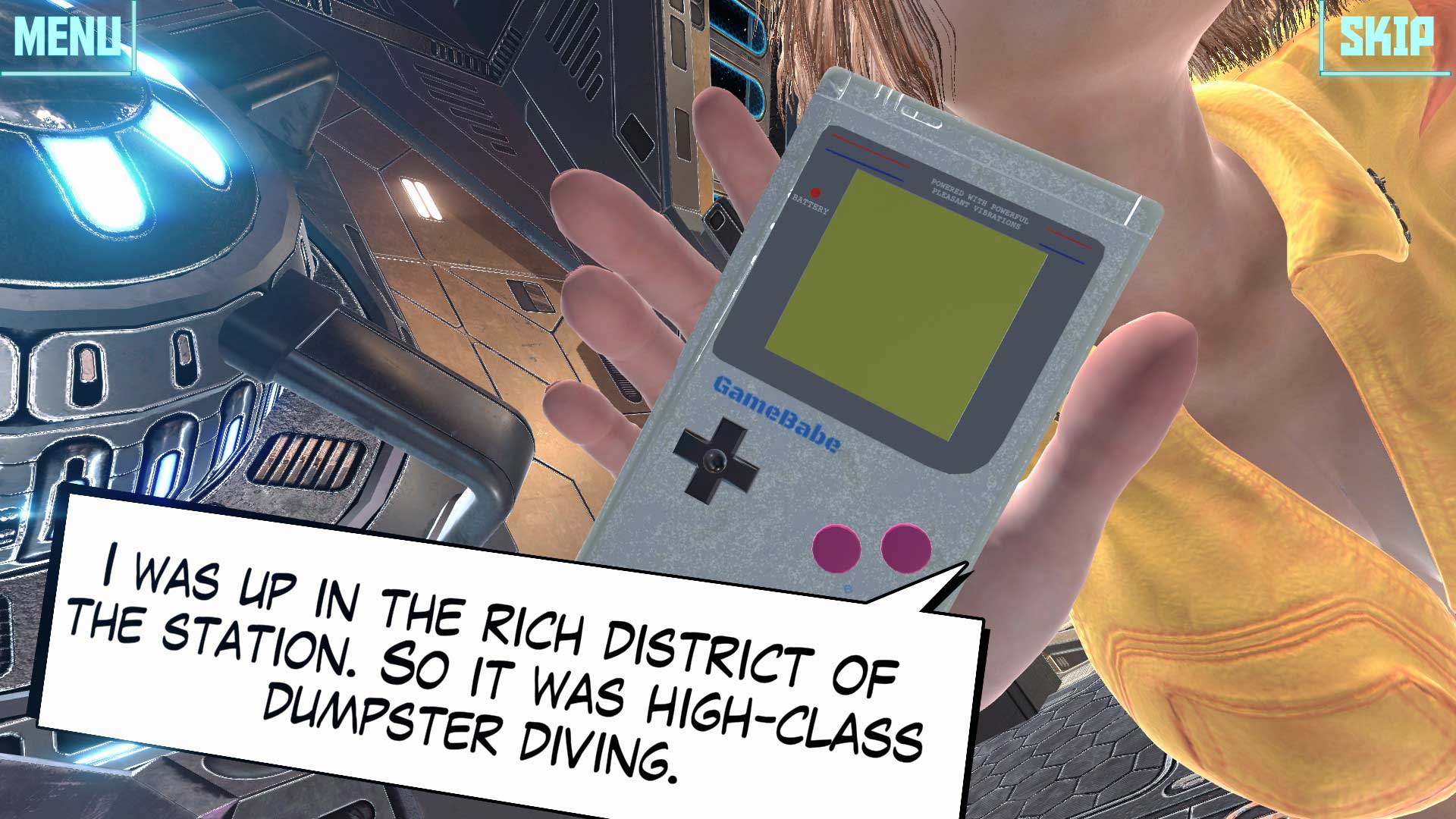 The game boots into the “Choose a Story” screen, where you can pick a (previously unlocked) tale to read. The interface looks darned good — it’s very aesthetically pleasing, and meshes well with the overall sci-fi theme. From “Settings”, you can adjust graphical and resolution preferences. It’s unclear how the “Graphics Quality” slider affects the in-game visuals, and I would have liked to have been able to adjust individual graphical settings (such as anti-aliasing or depth of field). There is also no audio preferences, which is kind of BS.